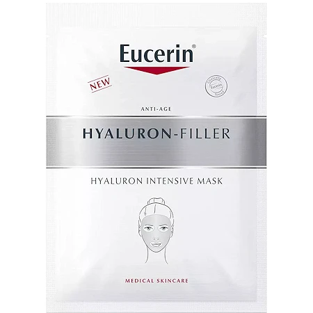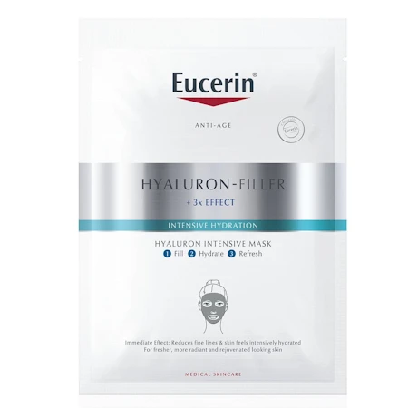 Eucerin Hyaluron-Filler Hyaluronová intenzivní maska (anti-age) obsahuje jedinečnou kombinaci značky Eucerin vysoko a nízkomolekulární kyselinu hyaluronovou. Vysokomolekulární kyselina hyaluronová zlepšuje hydrataci a vyhlazuje jemné linky v horních vrstvách pleti, zatímco nízkomolekulární kyselina hyaluronová s 40x menšími molekulami1 proniká hlouběji do epidermálních vrstev pleti, kde se tvoří hlubší vrásky.