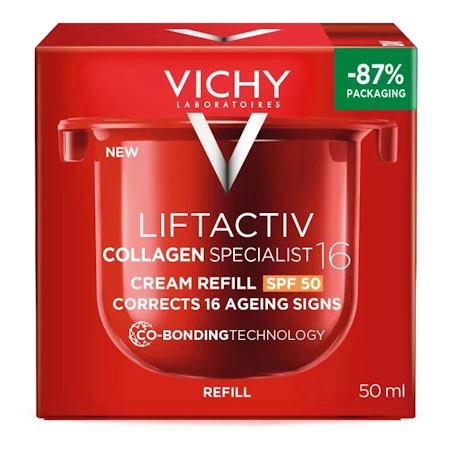 Krém Vichy Liftactiv Collagen Specialist 16 SPF50 má znovu plnitelnou nádobu. Opětovným plněním nádoby pomocí náplně můžete přispět ke snížení spotřeby skleněných, plastových a lepenkových obalů až o 87% v porovnání s opakovaným nákupem další nádoby.